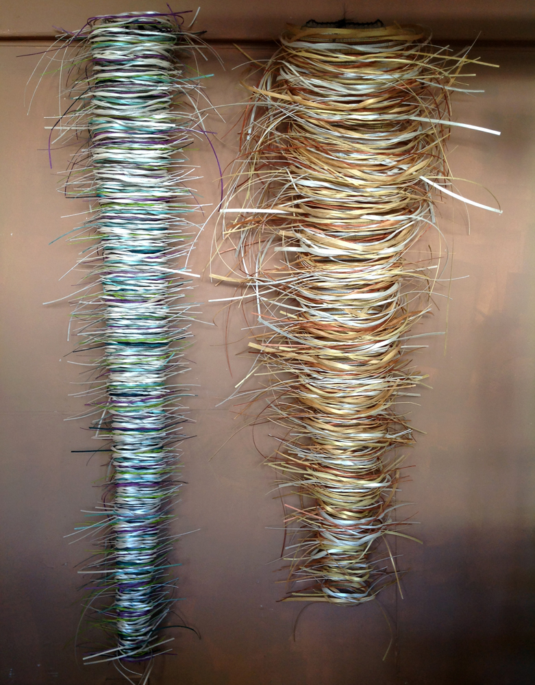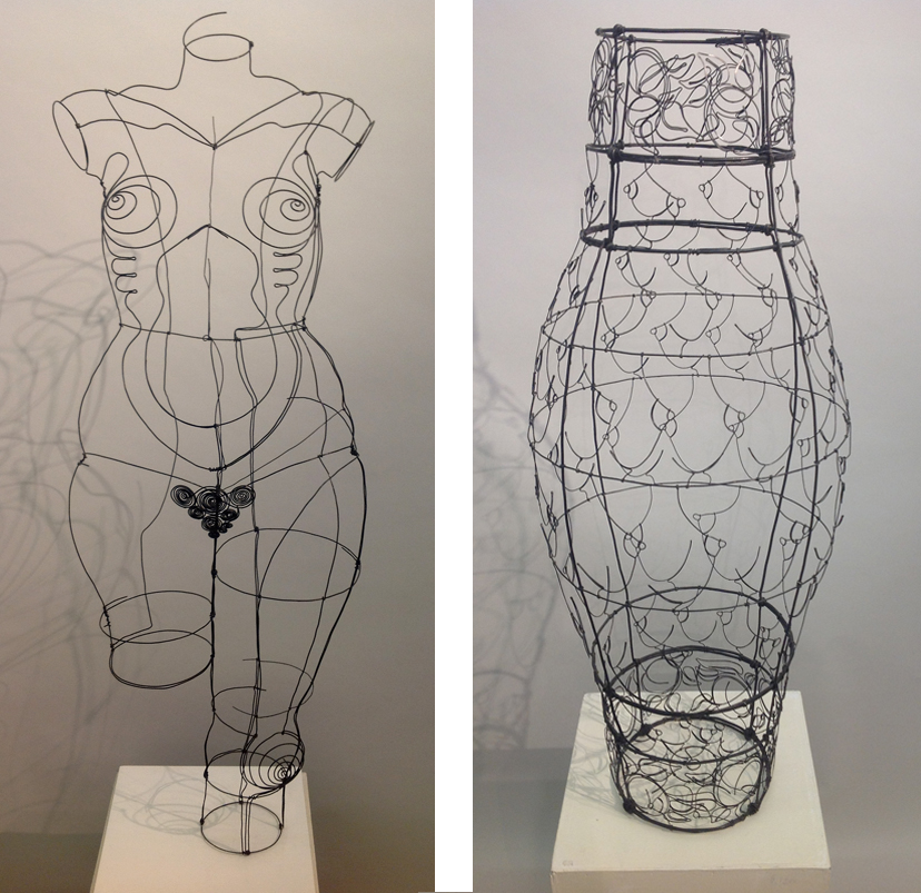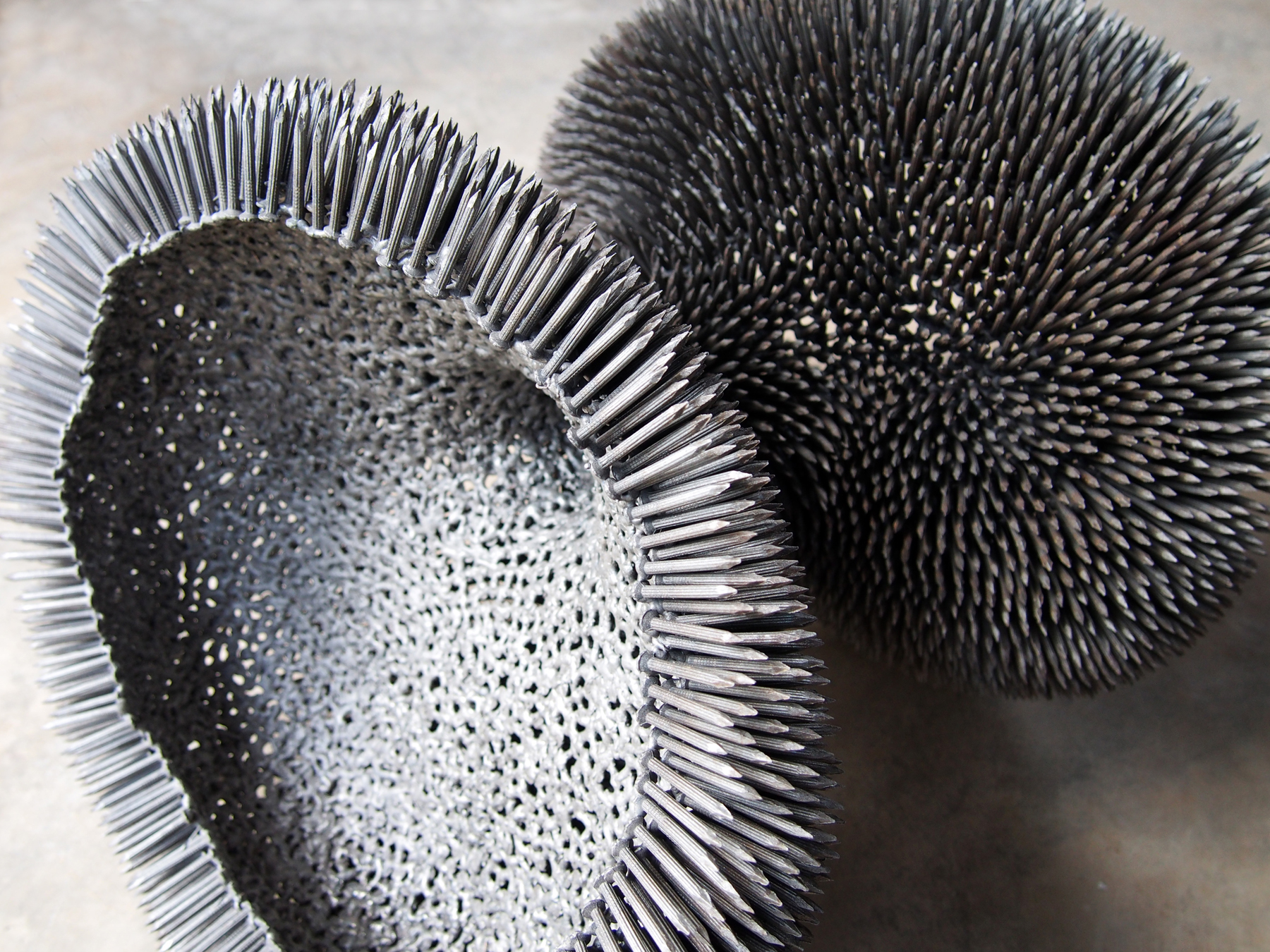 The sculptures are made of aluminum sheet and rods, rivets, screws, and paper. They are non-functioning and include rifles, semi automatic guns, and pistols.